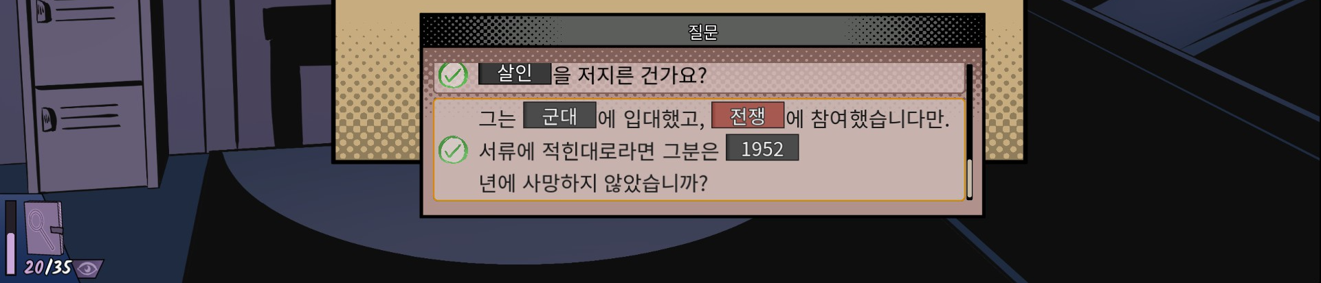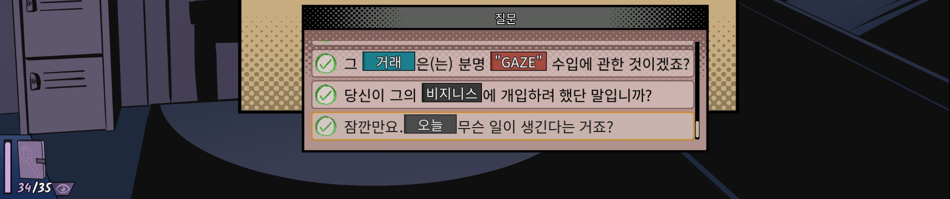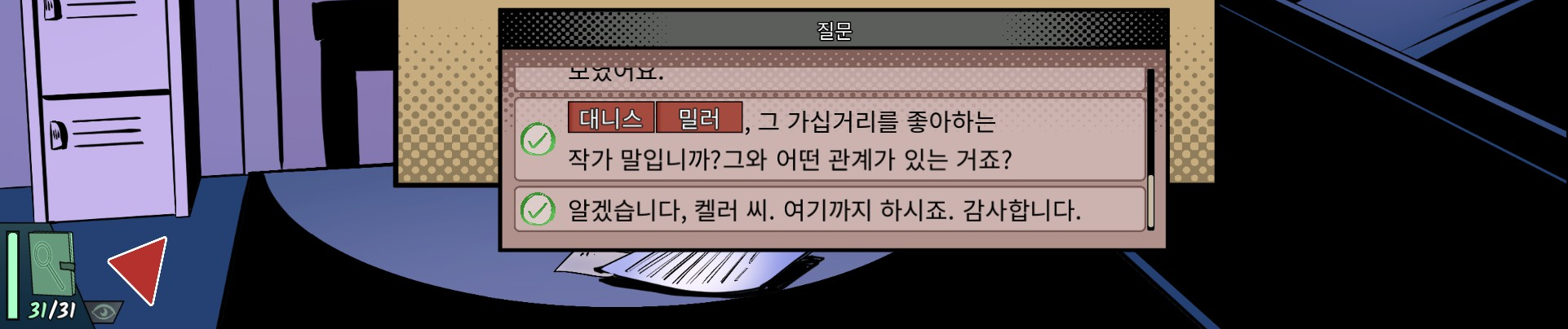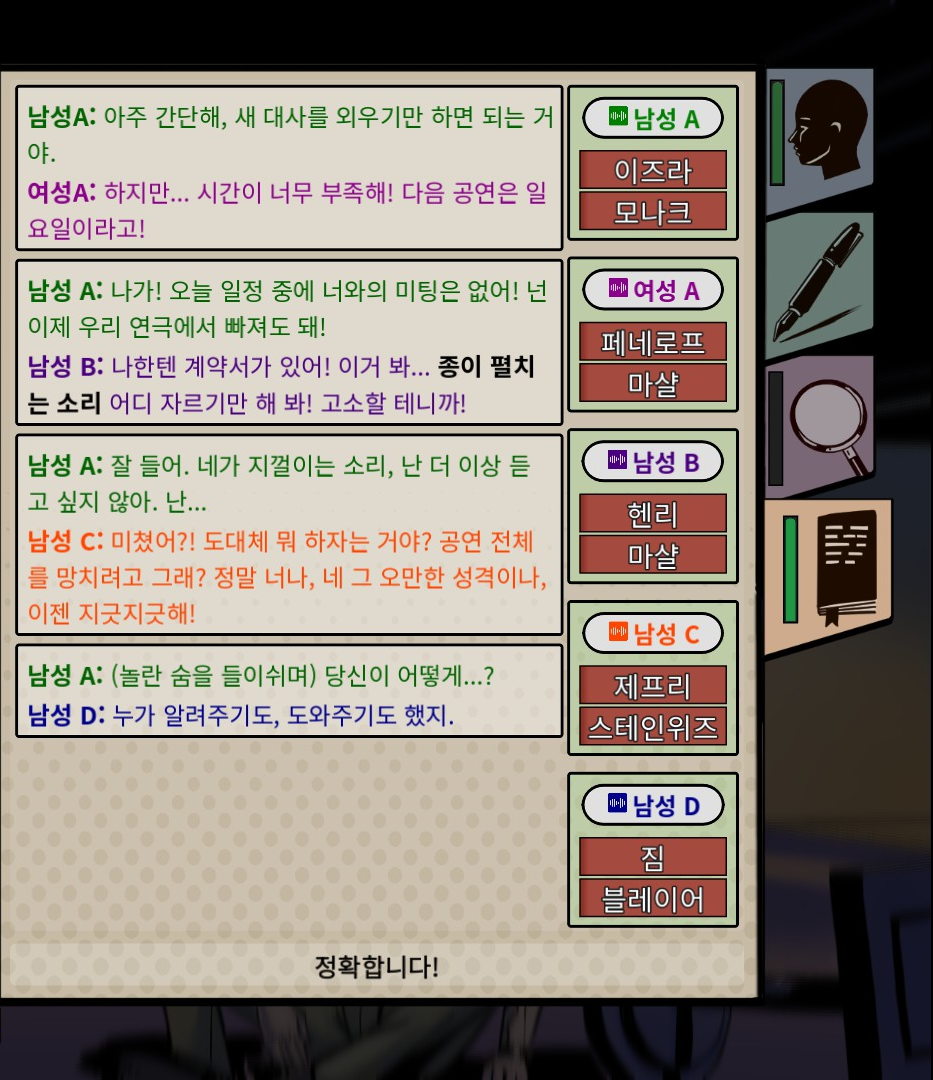 인물이 건네주는 여러 자료를 클릭해서