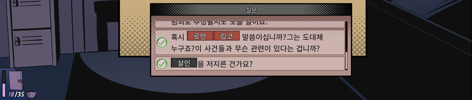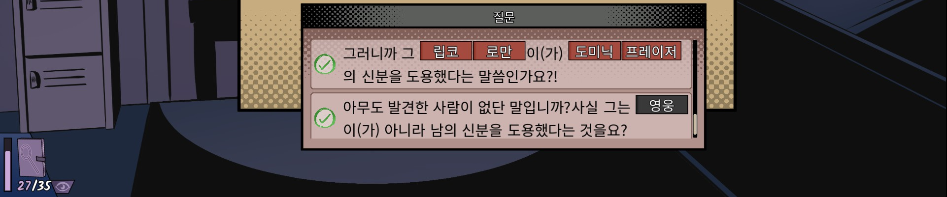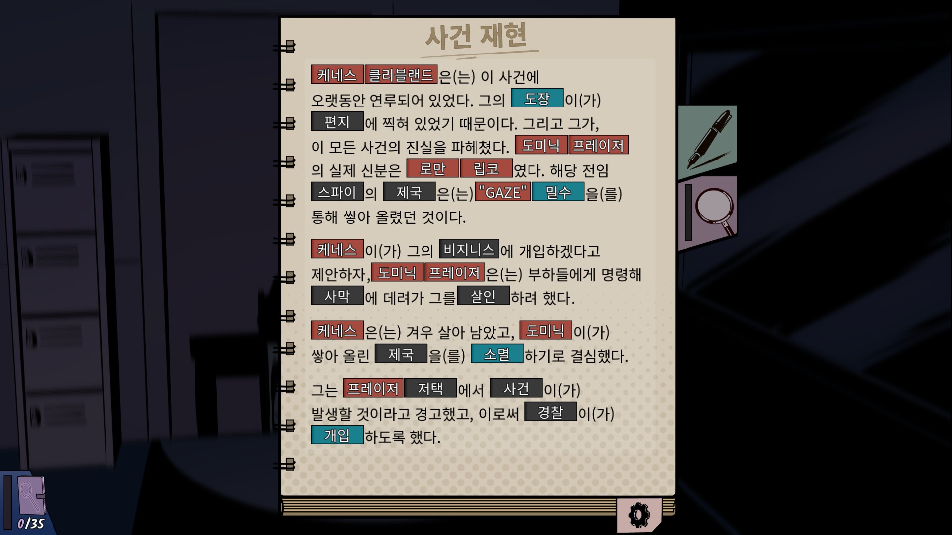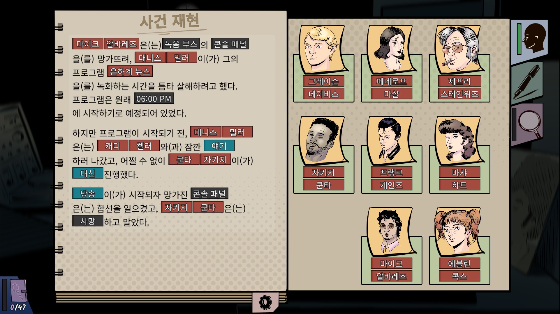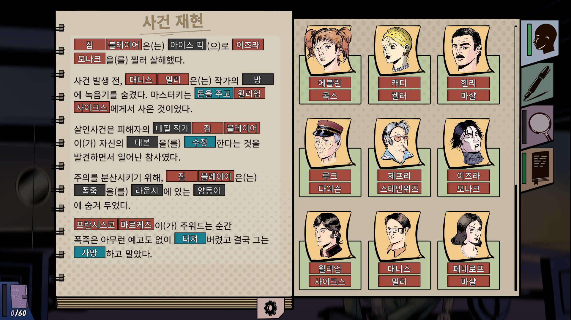 이때 수첩을 눌러 사건 재현을 완료하면